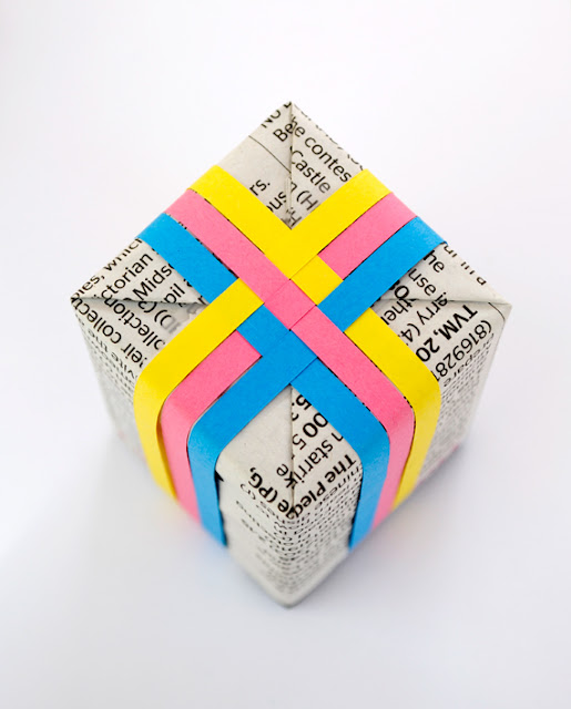 Woven paper gift wrap from minieco. It even comes with a tutorial, so no excuses.